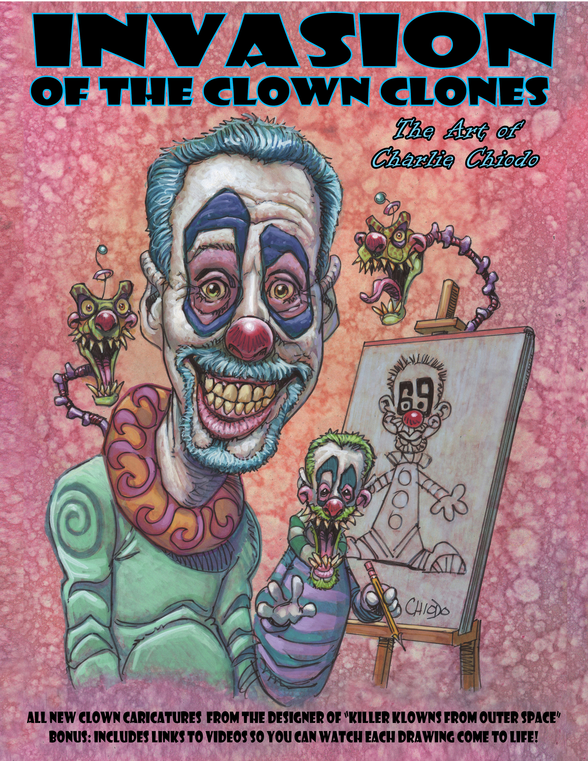 Our first book, “Invasion of the Clown Clones” (IOTCC), is an 8.5″ x 11″ softcover 50 page book of Charlie’s brilliantly clowned caricature art featuring several notable personalities being cloned into Killer Klowns. Check out Charlie’s